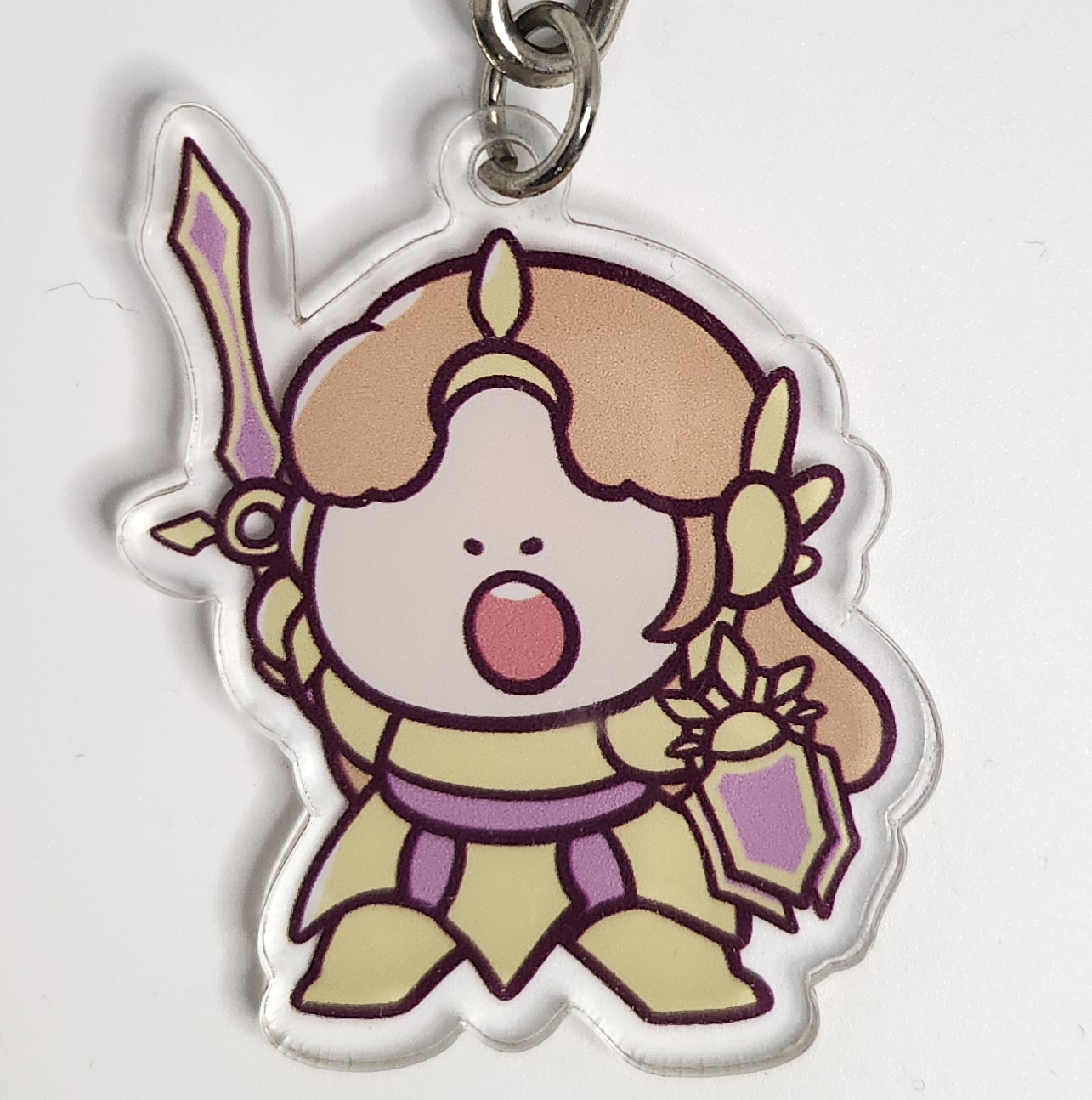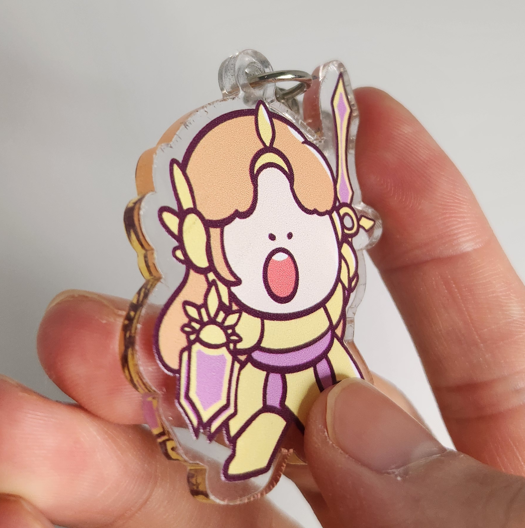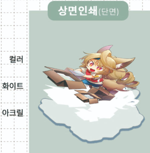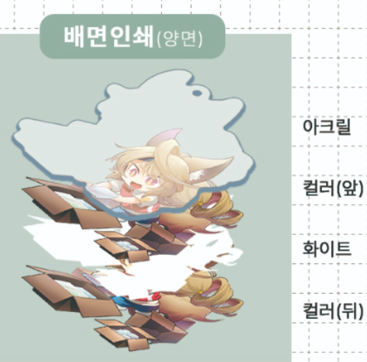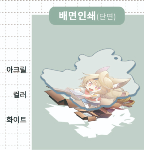 위 예시 사진들은 '꼬리 공방'에서 가져온 사진입니다. 대부분은 배면 인쇄를 많이 사용하는거 같습니다. 3. 단면 인쇄 vs 양면 인쇄 단면 인쇄는 말 그대로 한쪽 면만 인쇄하는 방식입니다. 위에 전면, 배면 인쇄 예시 사진이 단면 인쇄입니다. 제가 가지고 있는 단면 키링을 보여드리겠습니다.   단면+배면 방식으로 제작된 키링입니다. 뒷면은 화이트가 보이기 때문에 살짝 아쉽죠? 그 단점을 보안하기 위해 양면 인쇄가 있습니다! 양면 인쇄는 화이트 뒤에 한번 더 인쇄하는 방식입니다.