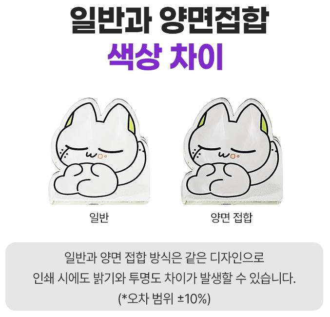 제가 가지고 있는 양면 키링입니다. 양면 + 배면 방식으로 제작됐습니다. 뒷면은 인쇄면이 만져집니다 (좌우 반전 됨) 한번 더 인쇄하는 만큼 단면이 더 싸고 양면이 더 비쌉니다. 4. 양면 인쇄 vs 양면 접합 양면 접합과 양면 인쇄는 다릅니다. 양면 인쇄의 경우 한쪽은 인쇄면이 만져 집니다. 즉 인쇄면이 손상될 수가 있다는 거죠 양면 접합은 이 단점까지 커버한 방식입니다.