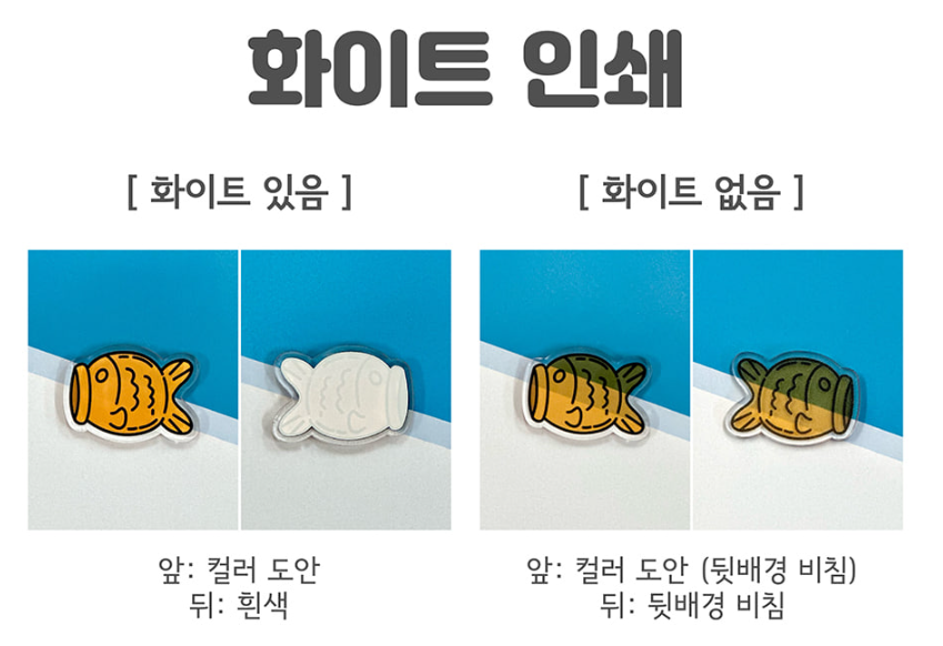 처음 아크릴 키링 제작할때 헷갈릴 수 있는 인쇄 방법을 정리해 봤습니다. 1. 화이트 인쇄 (=백색 인쇄) 아크릴 키링 인쇄 할때 화이트 인쇄가 들어가는 경우가 많습니다. 화이트 인쇄를 하는 이유는 아크릴 자체가 투명해서 화이트 영역이 없이 인쇄할 경우 색감이 제대로 표현되지 않기 때문입니다.