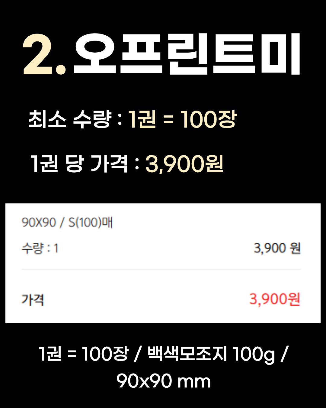2. 오프린트미최소 수량: 1권 (총 100장) 제작 단가: 1권당 3,900원 (1권=100장 기준) 상세 스펙: 백색 모조지 100g, 90x90 mm 특징: 단 1권만 인쇄할 수 있다는 것이 가장 큰 장점입니다. 테스트용 샘플을 뽑아보거나, 개인 소장용 떡메모지를 만들 때 적합합니다. 다만 1권 단위인 만큼 권당 단가는 다소 높습니다.