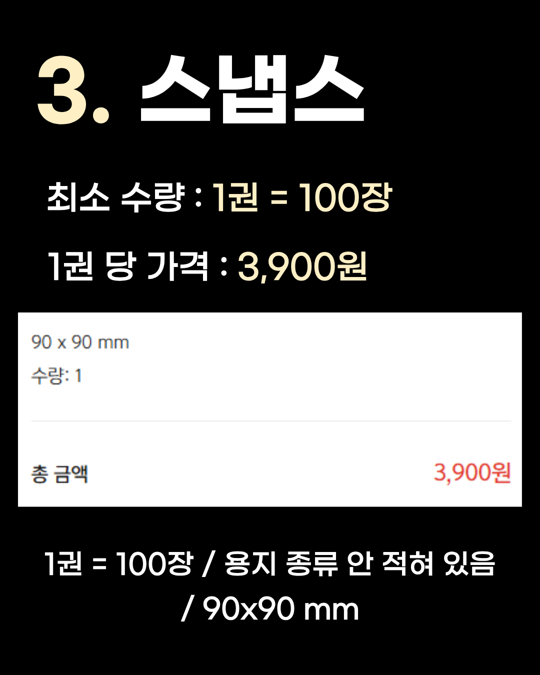 3. 스냅스최소 수량: 1권 (총 100장) 제작 단가: 1권당 3,900원 (1권=100장 기준) 상세 스펙: 90x90 mm (용지 종류 미표기) 특징: 오프린트미와 동일하게 1권부터 제작이 가능합니다. 평소 스냅스 플랫폼을 자주 이용하시거나, 다른 굿즈와 함께 소량 주문할 때 편리하게 이용할 수 있습니다.