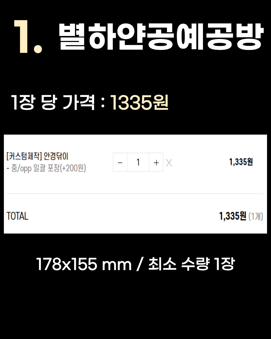 • 특징: 가격을 보고 제 눈을 의심했던 곳입니다. 보통 이 정도 단가는 최소 30장 이상 주문해야 나오는 대량 제작 가격인데, 놀랍게도 1장부터 이 가격에 제작이 가능합니다. 압도적인 1위 가성비를 보여주는 업체입니다.