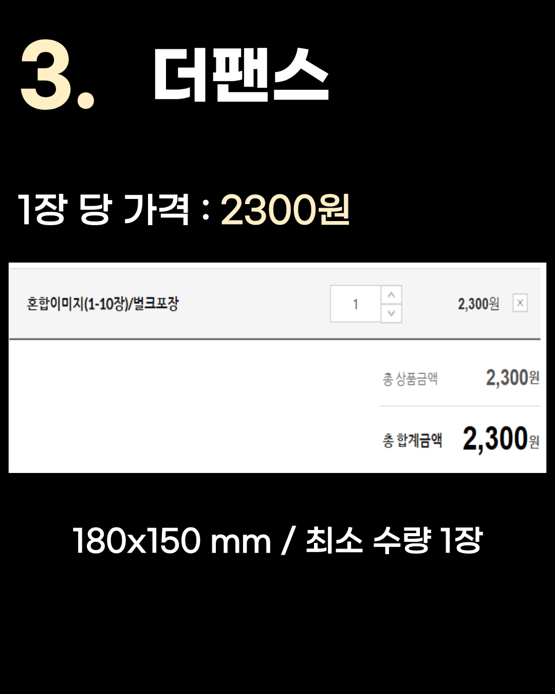 • 특징: 앞선 두 곳보다 약간 더 저렴한 2,300원에 1장 제작이 가능합니다. 퀄리티 높은 동인 굿즈 제작으로 많이 알려진 곳입니다.