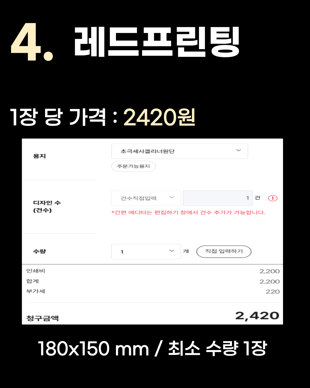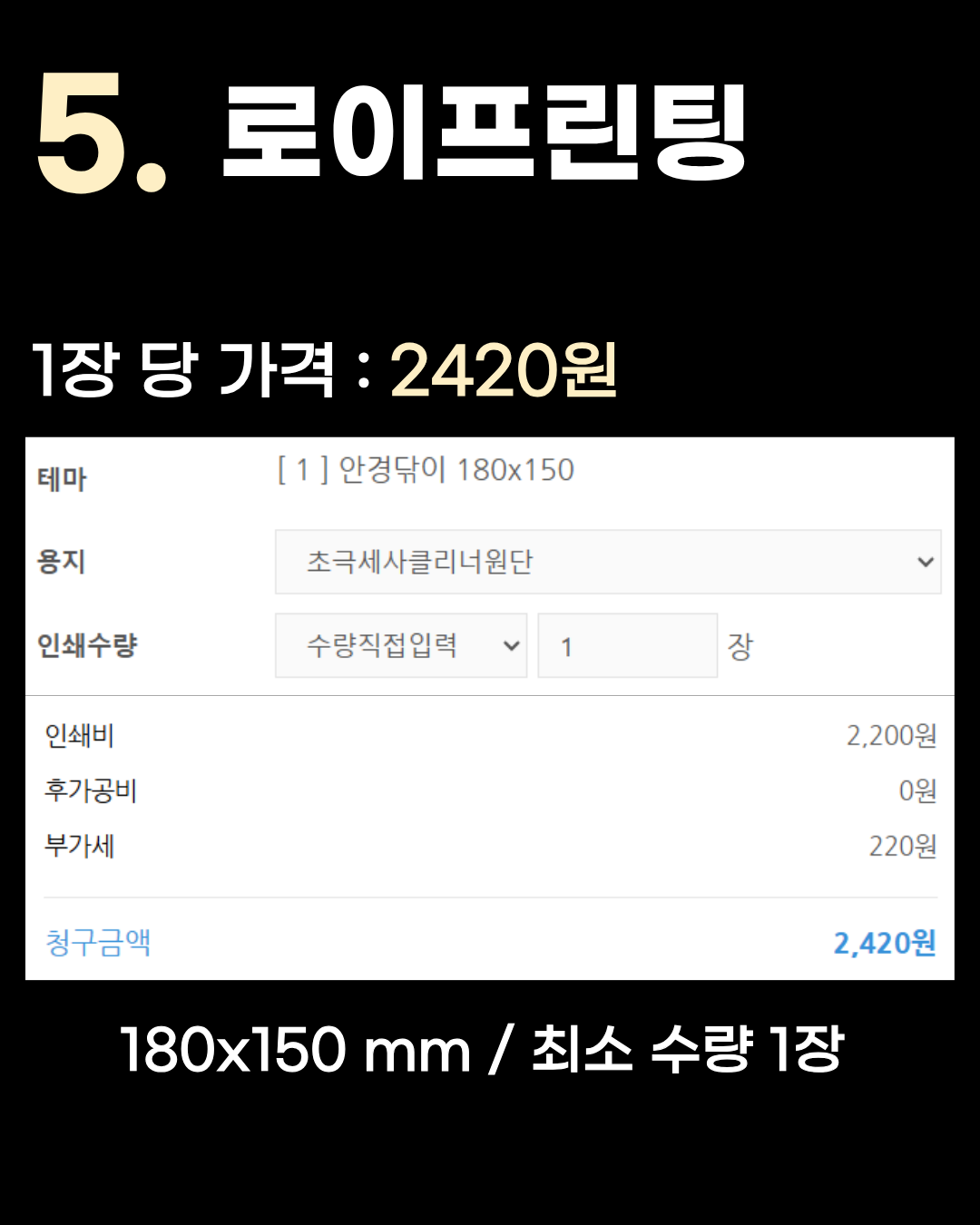 • 특징: 로이프린팅과 동일한 2,420원의 단가를 형성하고 있습니다. 시스템이 잘 갖춰져 있어 주문이 편리하고 접근성이 좋습니다.