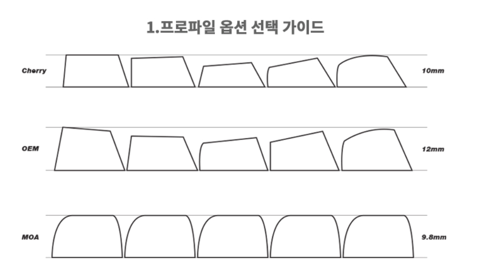 키캡 주문 제작할때 옵션을 보면 OEM, Cherry, MOA 이란 단어가 있죠 이 용어들이 어떤 걸 의미하는지 알아보겠습니다. 키캡 프로파일이란? 키캡의 프로파일은 키캡의 높이, 경사도, 표면의 곡률을 규격화한 것을 말합니다.