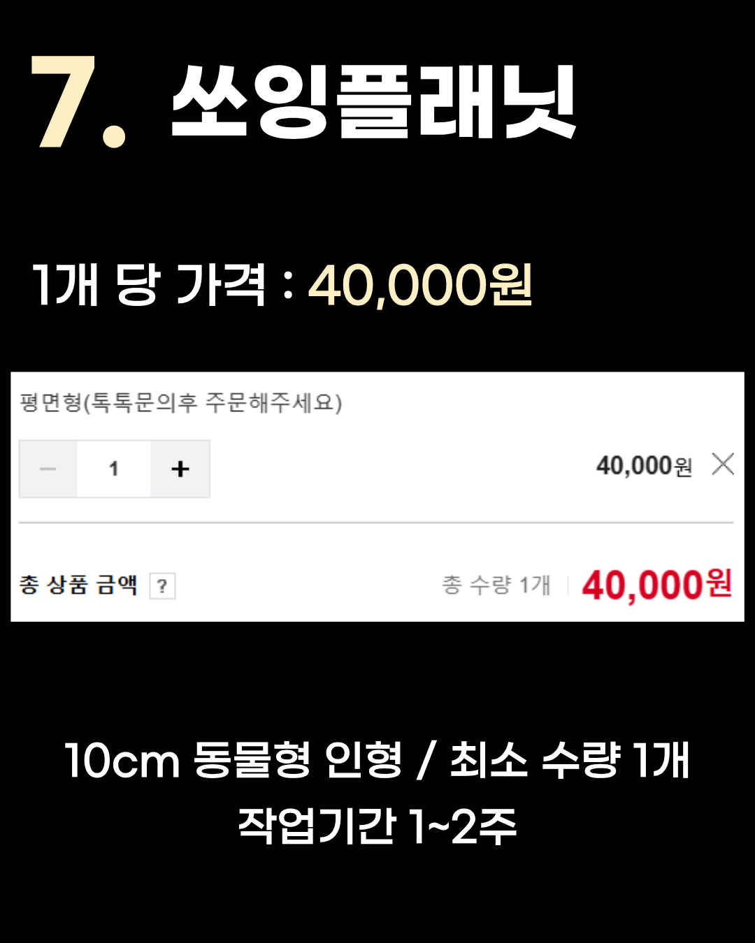 봉제 인형(솜인형) 제작하려고 검색해 봤는데, 업체는 너무 많고 어디가 저렴한지, 소량 제작은 가능한지 비교하기가 힘드셨죠? 그래서 제가 직접 업체들 하나하나 들어가서 단가와 최소 수량을 정리해 봤습니다. 이번 글에선 어떤 업체가 1개당 단가가 제일 저렴한지 알려드릴게요. (원단, 퀄리티, 자수 디테일 등 다른 건 제외하고 순수하게 1개당 단가 기준으로만 보겠습니다.) ⚠️ 주의 사항 ⚠️ 시작하기 전에 꼭 알아두셔야 할 점이 있습니다! 봉제인형은 사이즈, 원단 / 자수 / 인쇄 방식, 수량, 제작 난이도에 따라 실제 견적이 크게 달라질 수 있습니다. 정확한 금액은 반드시 업체에 직접 문의해 주세요. 제작 기간도 마찬가지로 업체 상황에 따라 달라질 수 있으니 참고 바랍니다! 단가 기준 먼저 단가를 어떤 기준으로 정리했는지 알려드리겠습니다. 각 업체 홈페이지에 명시된 최소 수량 또는 특정 수량 기준의 '1개당 가격'을 기준으로 잡았습니다. 인형은 아크릴 키링과 다르게 업체마다 요구하는 최소 제작 수량(MOQ)이 전부 다르기 때문에, 단가가 저렴하더라도 대량으로만 주문해야 할 수도 있습니다. 이 점 꼭 유의해서 봐주세요! 봉제 인형 단가 저렴한 업체 TOP 7 정리된 인형 제작 업체 중 1개당 단가가 저렴한 TOP 7입니다. 7위 쏘잉플래닛