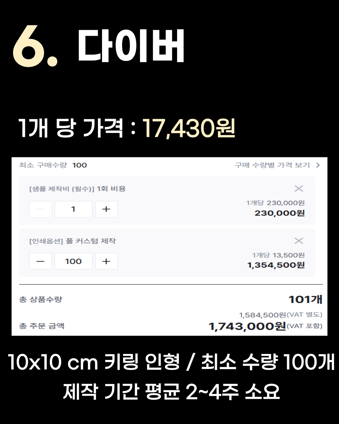 10x10 cm 키링 인형 / 최소 수량 100개 / 제작 기간 평균 2~4주 6위는 1개당 17,430원인 다이버입니다. 최소 구매 수량이 100개이며, 샘플 제작비(230,000원)와 인쇄 옵션 등이 포함된 100개 기준 견적에서 산출된 1개당 단가입니다. 5위 소다코리아