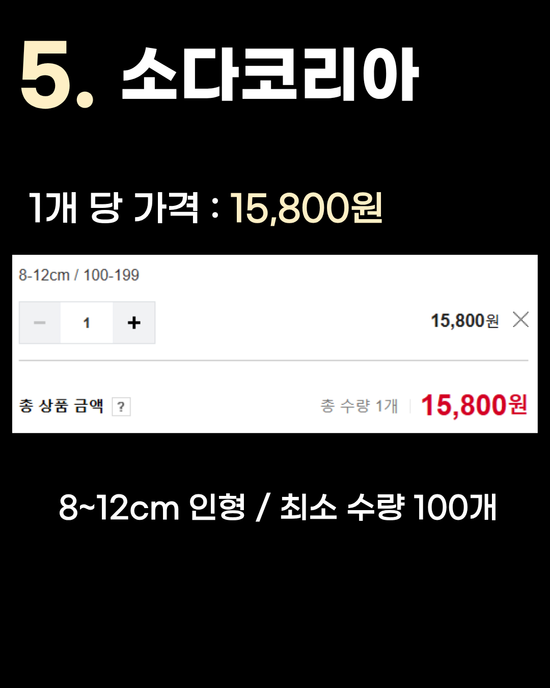 8~12cm 인형 / 최소 수량 100개 5위는 1개당 15,800원인 소다코리아입니다. 100개 단위로 제작하실 때 무난하게 고려해 볼 수 있는 가격대입니다. 4위 주다기프트