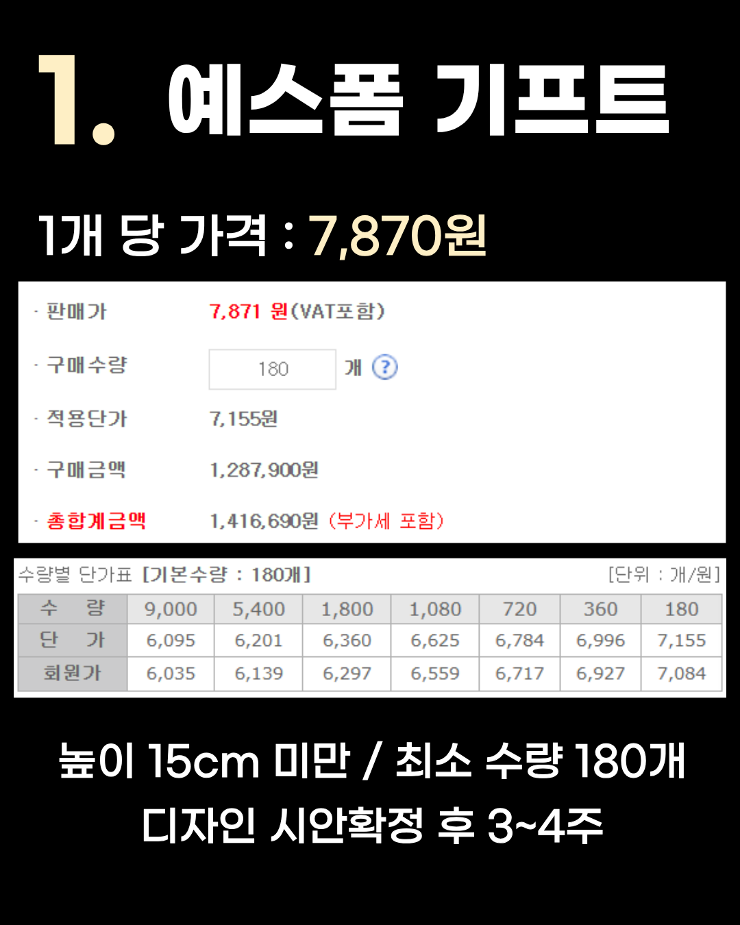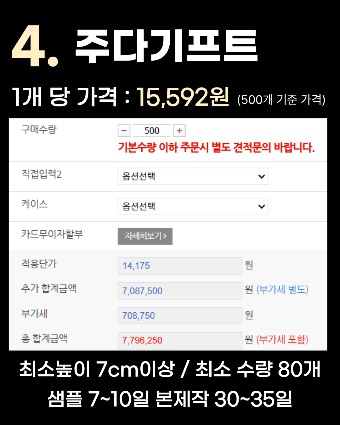4위는 1개당 15,592원인 주다기프트입니다. 최소 높이 7cm 이상 / 최소 수량 80개 / 샘플 7~10일, 본제작 30~35일 주의하실 점은 이 가격은 500개 주문을 기준으로 한 단가입니다. 최소 수량인 80개 이하로 주문하실 경우 별도로 견적 문의를 하셔야 하니 참고해 주세요. 3위 나인스타아트
