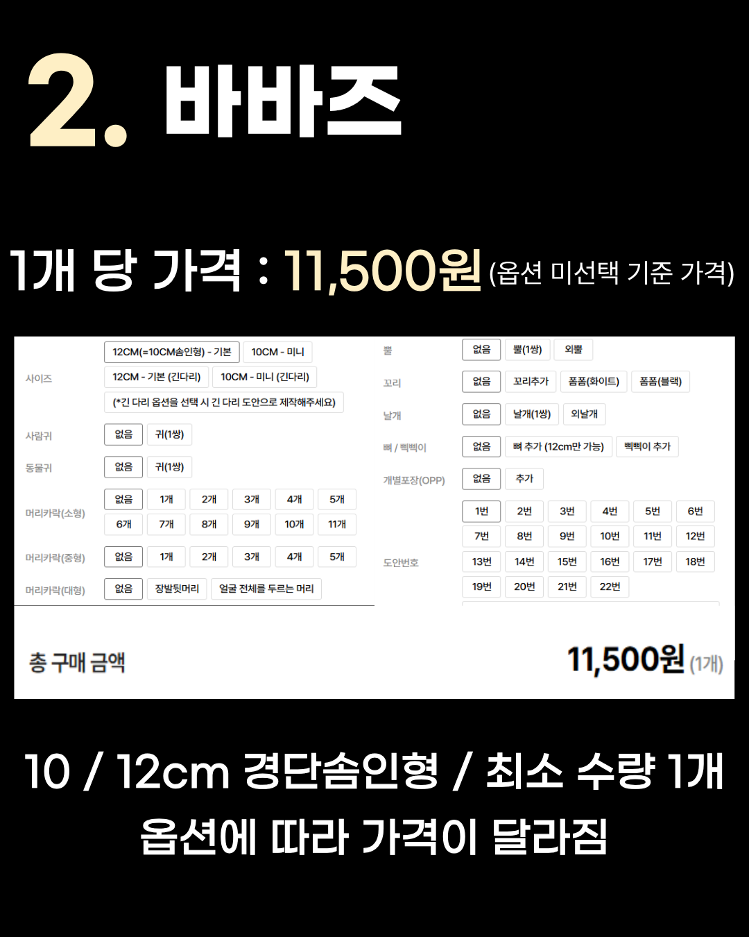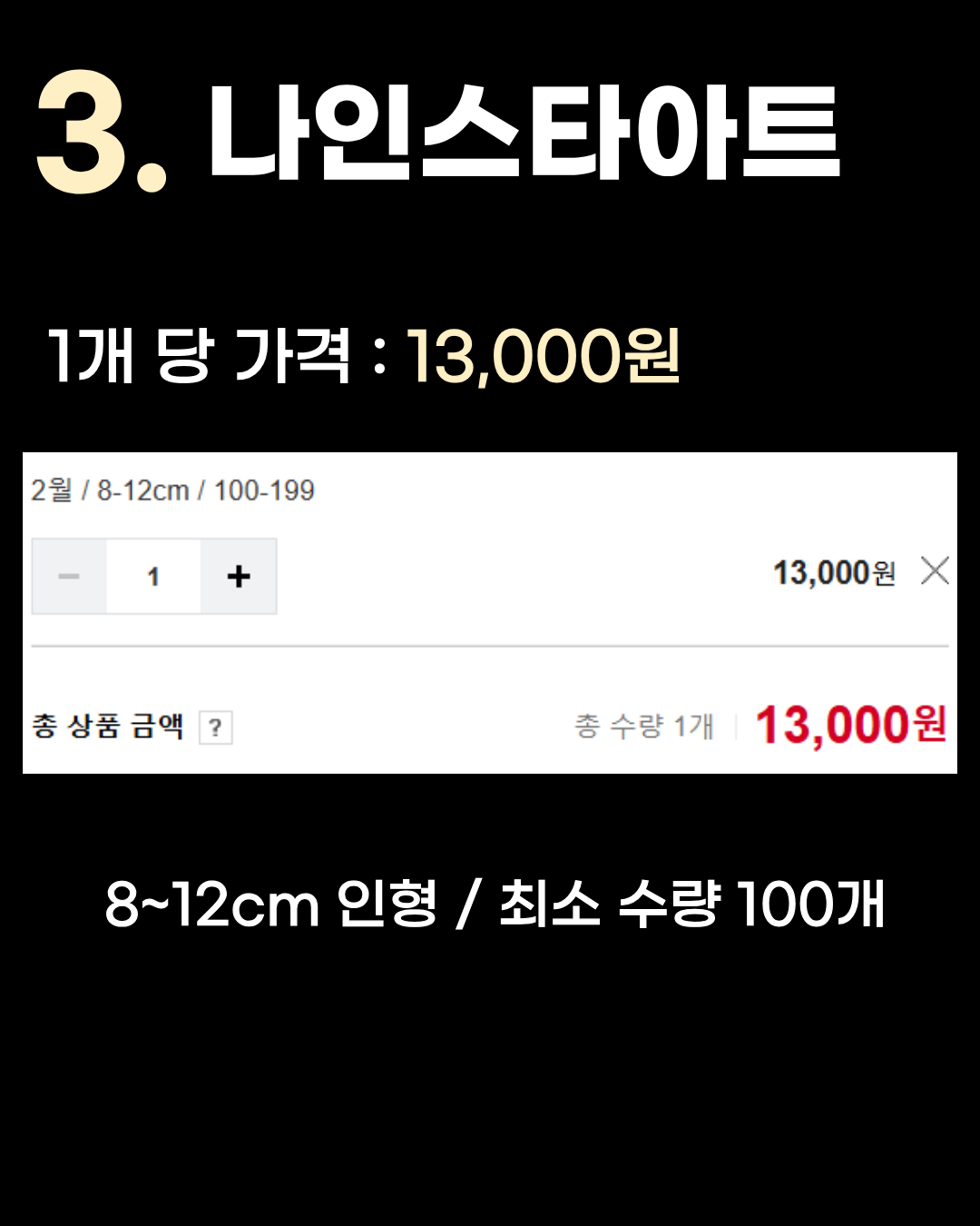 8~12cm 인형 / 최소 수량 100개 3위는 1개당 13,000원인 나인스타아트입니다. 5위인 소다코리아와 비슷한 스펙(8~12cm, 100개 기준)이지만 단가가 조금 더 저렴하게 형성되어 있습니다. 2위 바바즈