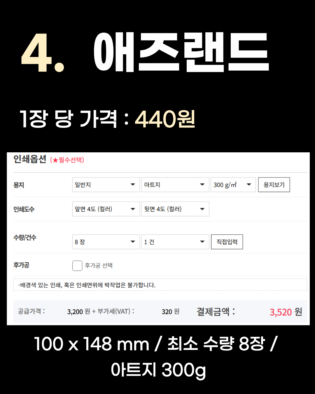 100 x 148 mm / 최소 수량 8장 / 아트지 300g 4위는 1장당 440원인 애즈랜드입니다. 기본적인 엽서 사이즈에 아트지 300g을 사용하여 탄탄한 엽서를 8장부터 소량 제작할 수 있습니다. 3위 블랭커팩토리