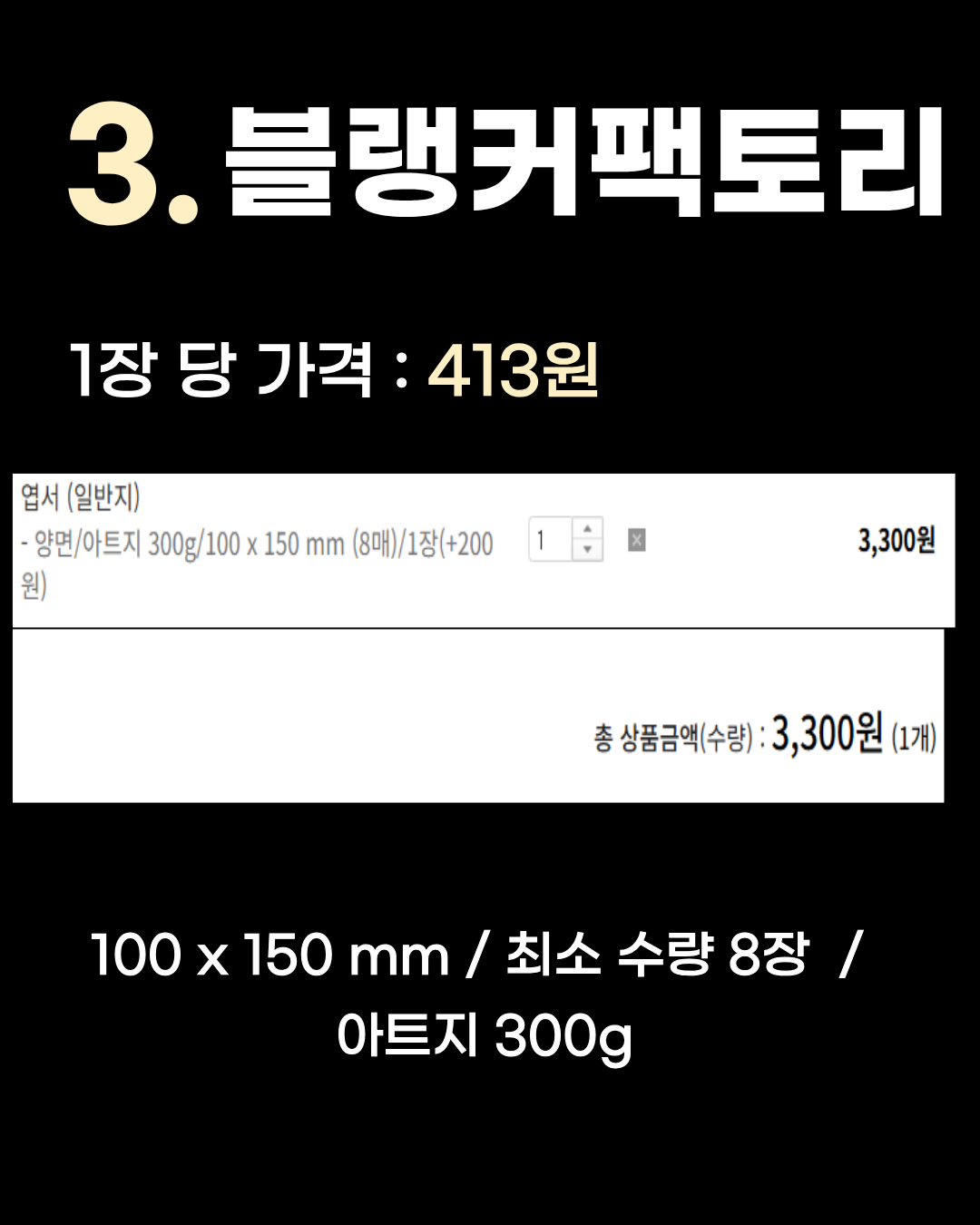 100 x 150 mm / 최소 수량 8장 / 아트지 300g 3위는 1장당 413원인 블랭커팩토리입니다. 애즈랜드와 비슷한 스펙(아트지 300g, 최소 8장)이지만 단가가 조금 더 저렴하게 형성되어 있습니다. 2위 비즈하우스