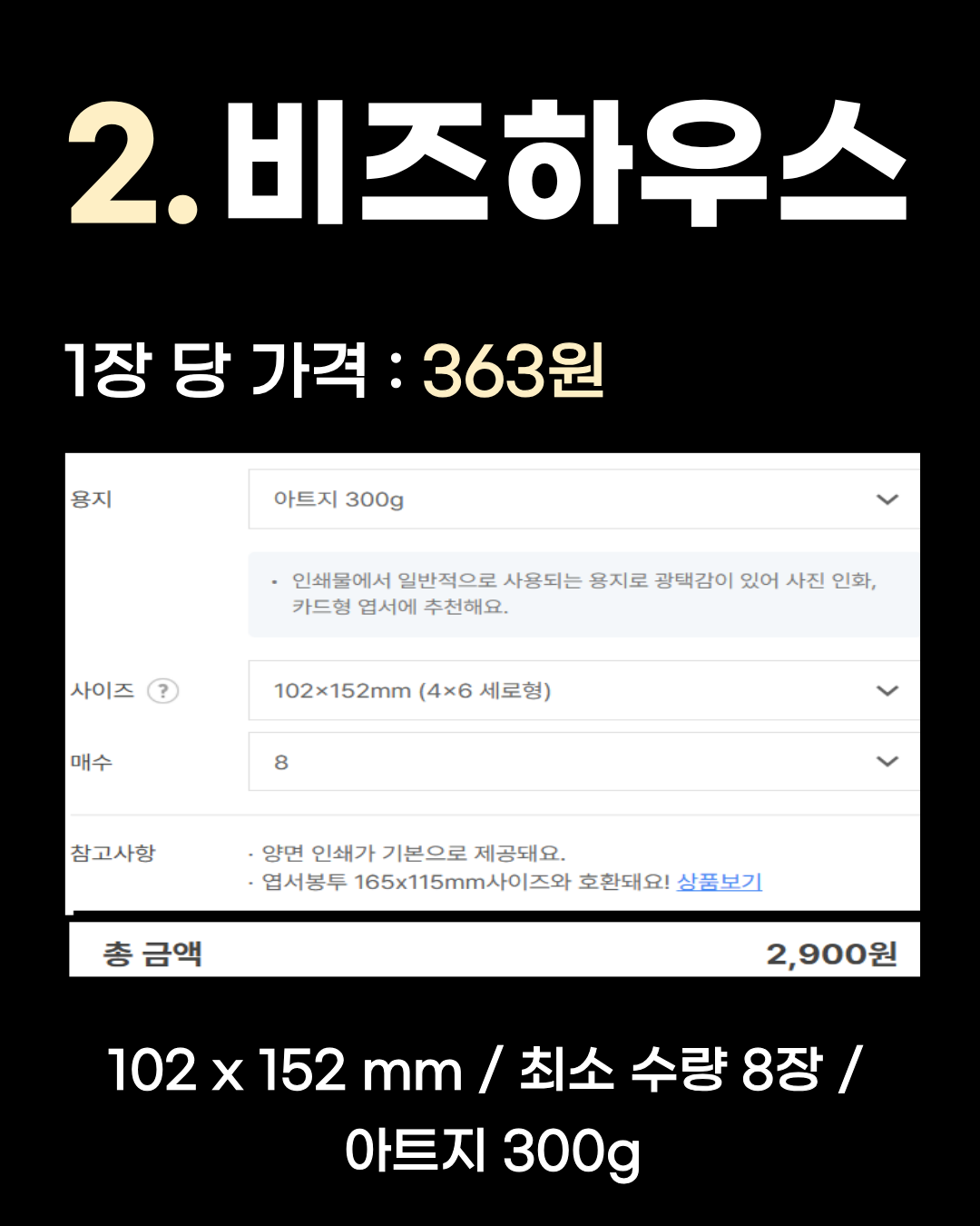 102 x 152 mm / 최소 수량 8장 / 아트지 300g 2위는 1장당 363원인 비즈하우스입니다. 마찬가지로 최소 수량 8장에 아트지 300g 기준이며, 사이즈가 102x152mm로 약간 더 큰 규격입니다. 1위 오프린트미