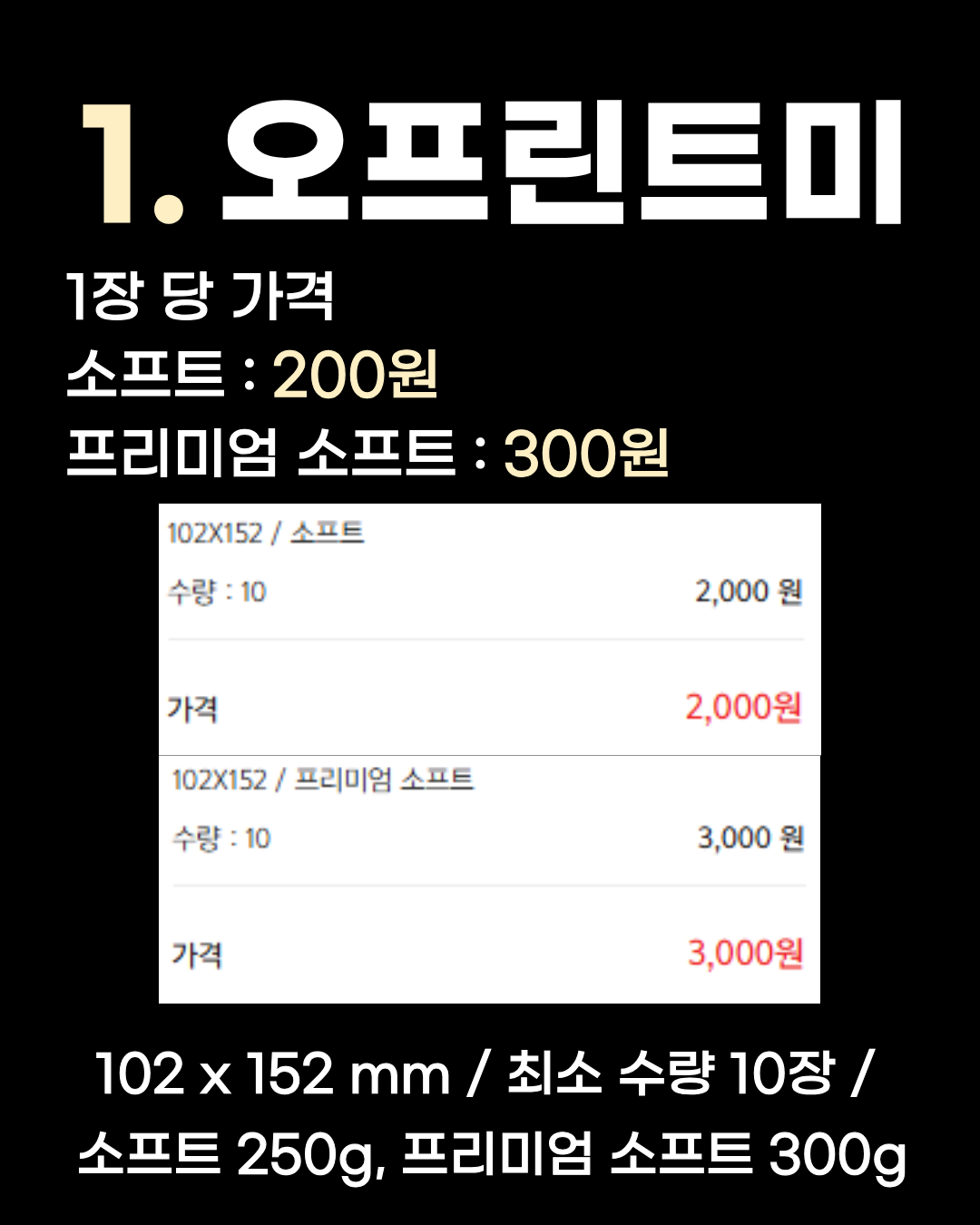 102 x 152 mm / 최소 수량 10장 / 소프트 250g, 프리미엄 소프트 300g 대망의 1위 업체는 15개 업체 중 단가가 가장 저렴한 오프린트미입니다! 소프트(250g) 재질 선택 시 1장당 200원, 두께감이 있는 프리미엄 소프트(300g)를 선택해도 1장당 300원으로 압도적인 가성비를 자랑합니다. 최소 수량은 10장부터 제작이 가능합니다. 혹시 아트지 말고 스노우, 랑데뷰, 몽블랑 등 다른 용지의 가격도 궁금하신가요? 자카픽 업체 비교에서 다양한 지류 옵션과 다른 굿즈 제작 업체의 단가도 한눈에 확인해 보세요! |