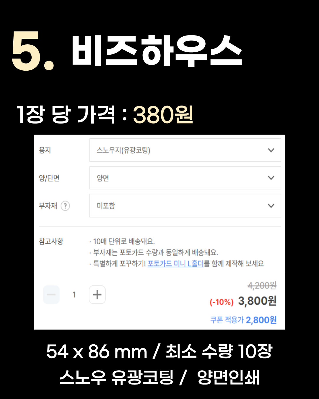 54 x 86 mm / 최소 수량 10장 / 스노우 유광코팅 / 양면인쇄 5위는 1장당 380원인 비즈하우스입니다. 10장부터 소량 제작이 가능하며, 대중적으로 많이 쓰이는 스노우지에 유광코팅이 들어간 기본 옵션입니다. 4위 와우프레스