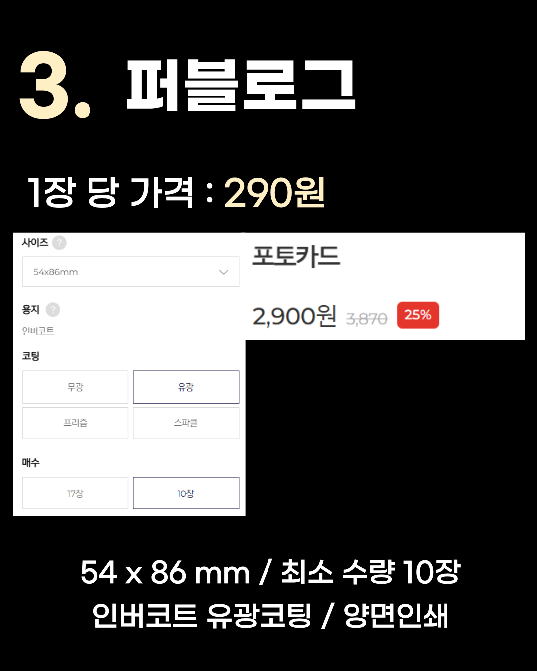 54 x 86 mm / 최소 수량 10장 / 인버코트 유광코팅 / 양면인쇄 3위는 1장당 290원인 퍼블로그입니다. 최소 수량 10장 기준이며, 고급 용지인 인버코트 재질에 유광코팅을 적용하고도 1장당 300원 이하의 저렴한 단가를 보여줍니다. 2위 프린트시티