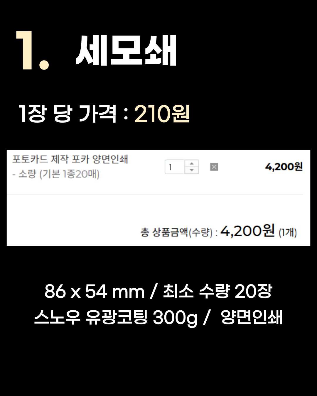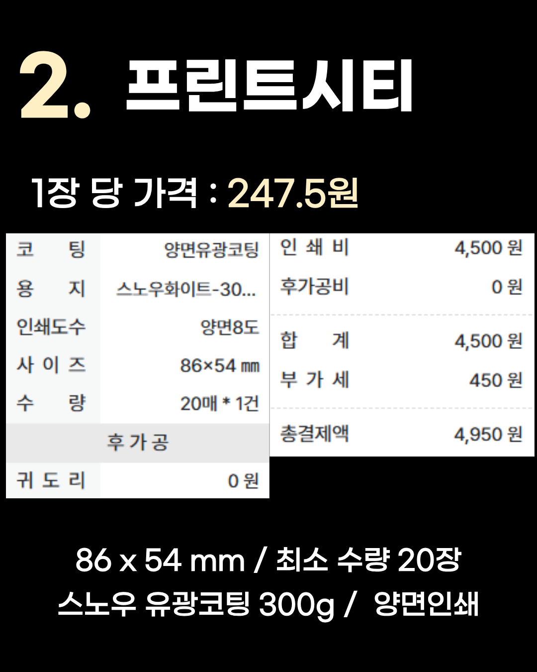 86 x 54 mm / 최소 수량 20장 / 스노우 유광코팅 300g / 양면인쇄 2위는 1장당 247.5원인 프린트시티입니다. 여기서부터는 최소 수량이 20장으로 늘어나지만, 1장당 가격이 200원대 중반으로 확 저렴해져서 여러 장을 뽑을 때 가성비가 매우 좋습니다. 1위 세모쇄