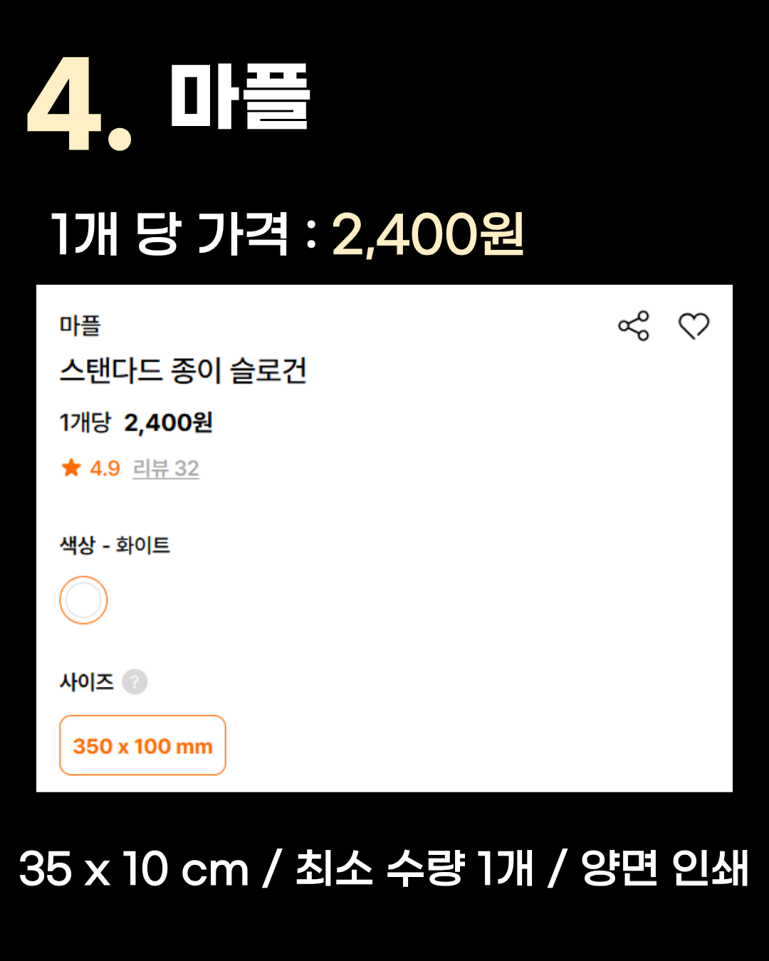 35 x 10 cm / 최소 수량 1개 / 양면 인쇄 4위는 1개당 2,400원인 마플입니다. 단가가 가장 높아 보일 수 있지만, 무려 단 1개부터 소량 제작이 가능하다는 엄청난 장점이 있습니다! 딱 한 장만 필요할 때 이용하기 좋습니다. 3위 인팟(INPOD)