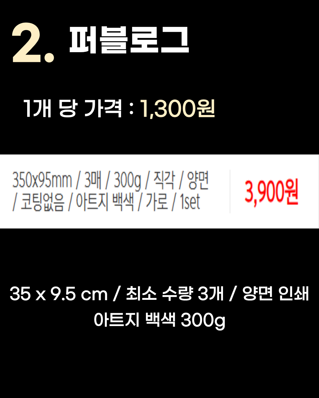 35 x 9.5 cm / 최소 수량 3개 / 양면 인쇄 / 아트지 백색 300g 2위는 1개당 1,300원인 퍼블로그입니다. 3위인 인팟과 마찬가지로 최소 수량이 3개부터 시작하는데 단가는 더 저렴하며, 탄탄한 아트지 백색 300g 용지를 사용합니다. 세로 규격이 9.5cm인 점 참고해 주세요. 1위 포토몬