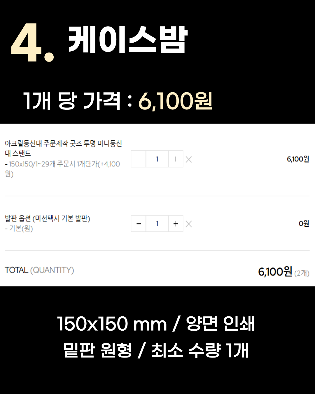 150x150 mm / 양면 인쇄 / 밑판 원형 / 최소 수량 1개 4위는 1개당 6,100원인 케이스밤입니다. 단 1개부터 소량 제작이 가능하며, 150x150mm의 넉넉한 사이즈에 원형 밑판이 기본으로 제공됩니다. 3. 낭만인쇄소