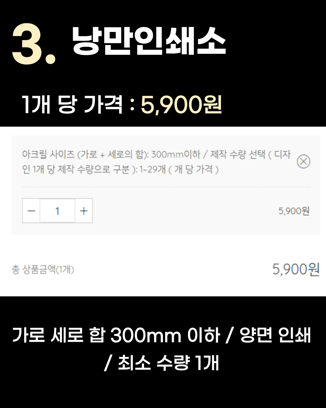 가로 세로 합 300mm 이하 / 양면 인쇄 / 최소 수량 1개 3위는 1개당 5,900원인 낭만인쇄소입니다. 가로 세로 합 300mm 이하 규격으로, 단가가 5천 원대로 떨어져 가성비가 좋아지기 시작하는 구간입니다. 2. 푸푸상점