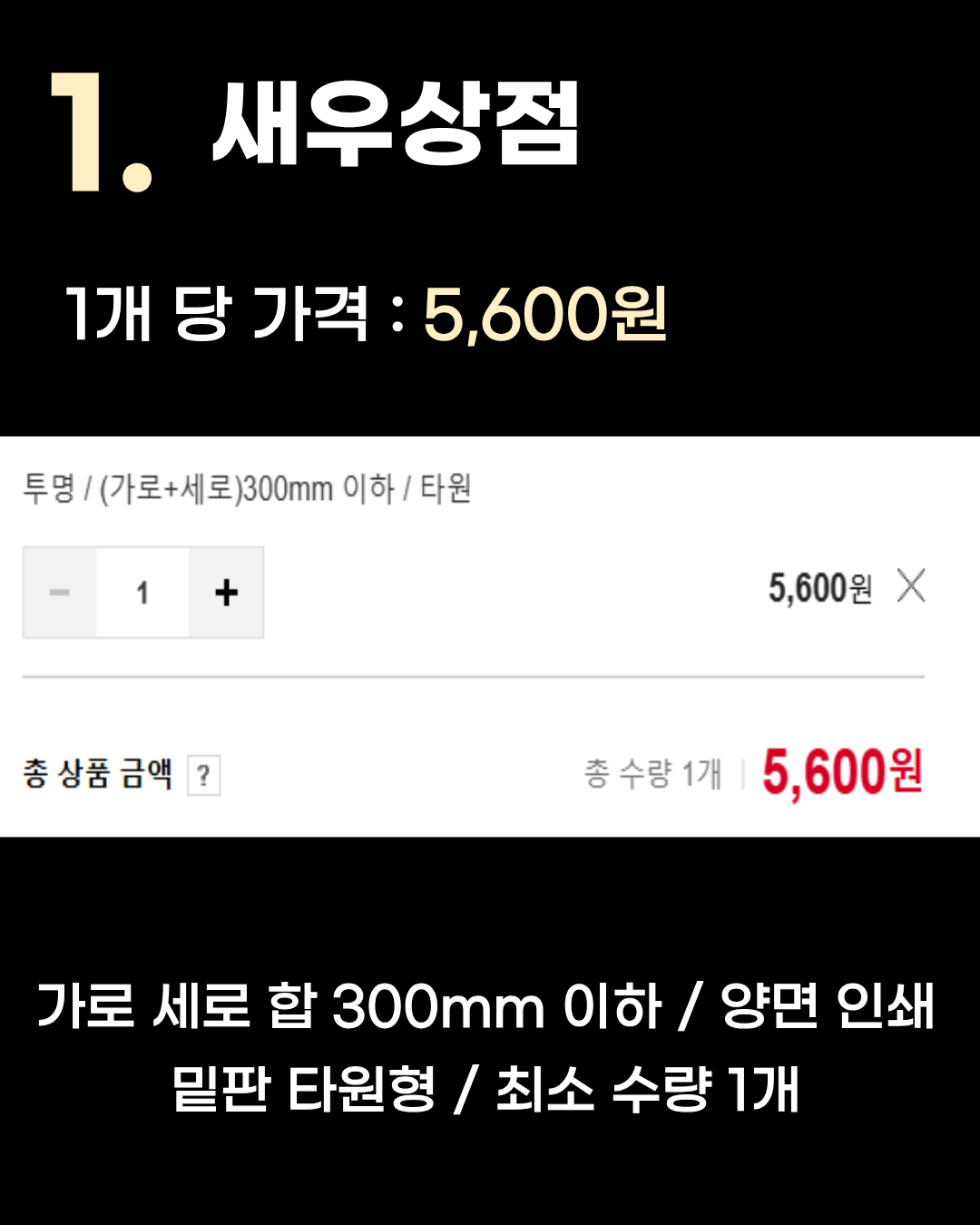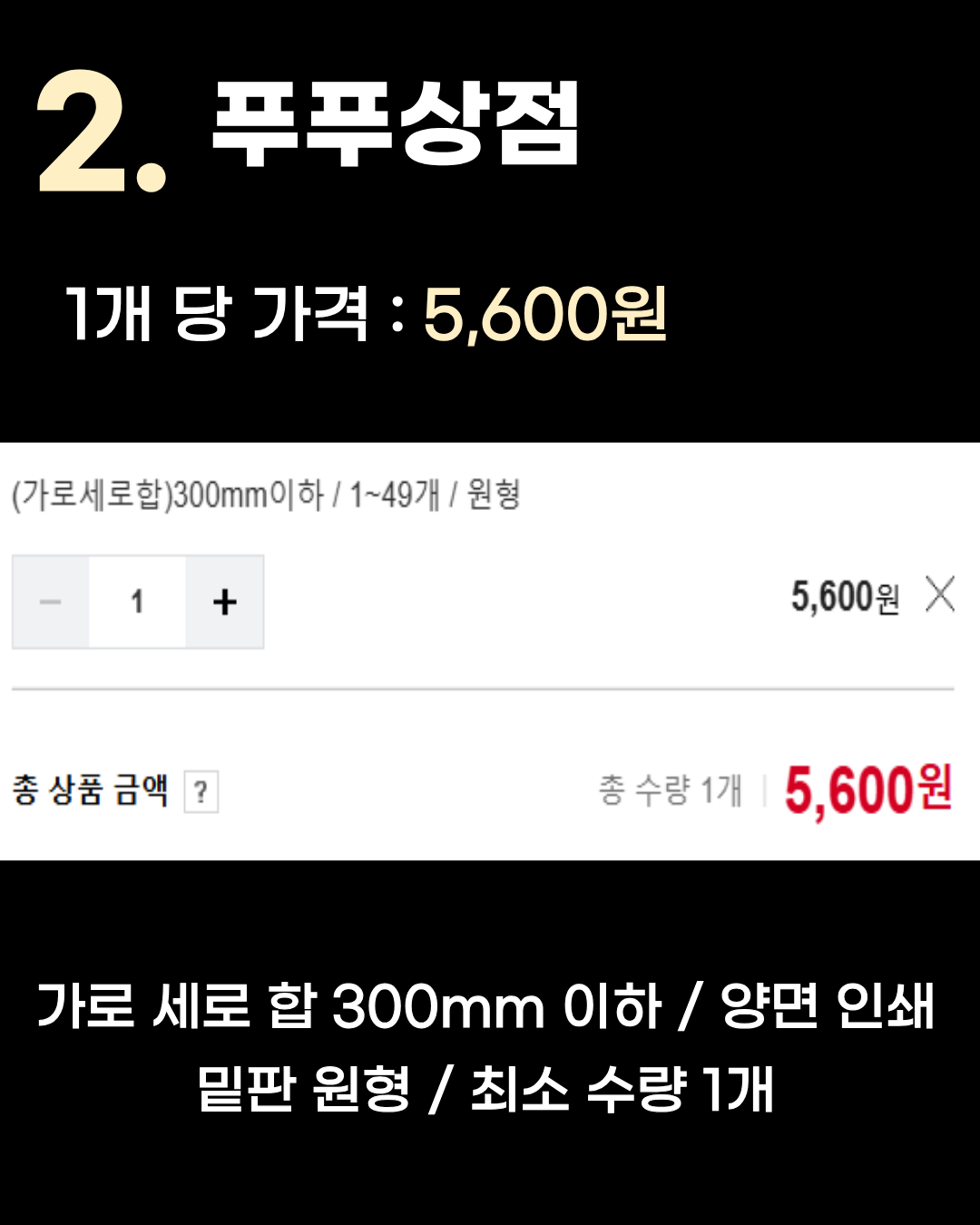 가로 세로 합 300mm 이하 / 양면 인쇄 / 밑판 원형 / 최소 수량 1개 2위는 1개당 5,600원인 푸푸상점입니다. (사실 공동 1위 입니다) 마찬가지로 가로 세로 합 300mm 이하 기준이며, 원형 밑판에 양면 인쇄를 5,600원이라는 저렴한 가격에 1개부터 제작할 수 있습니다. 1. 새우상점