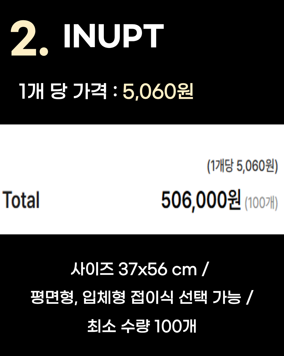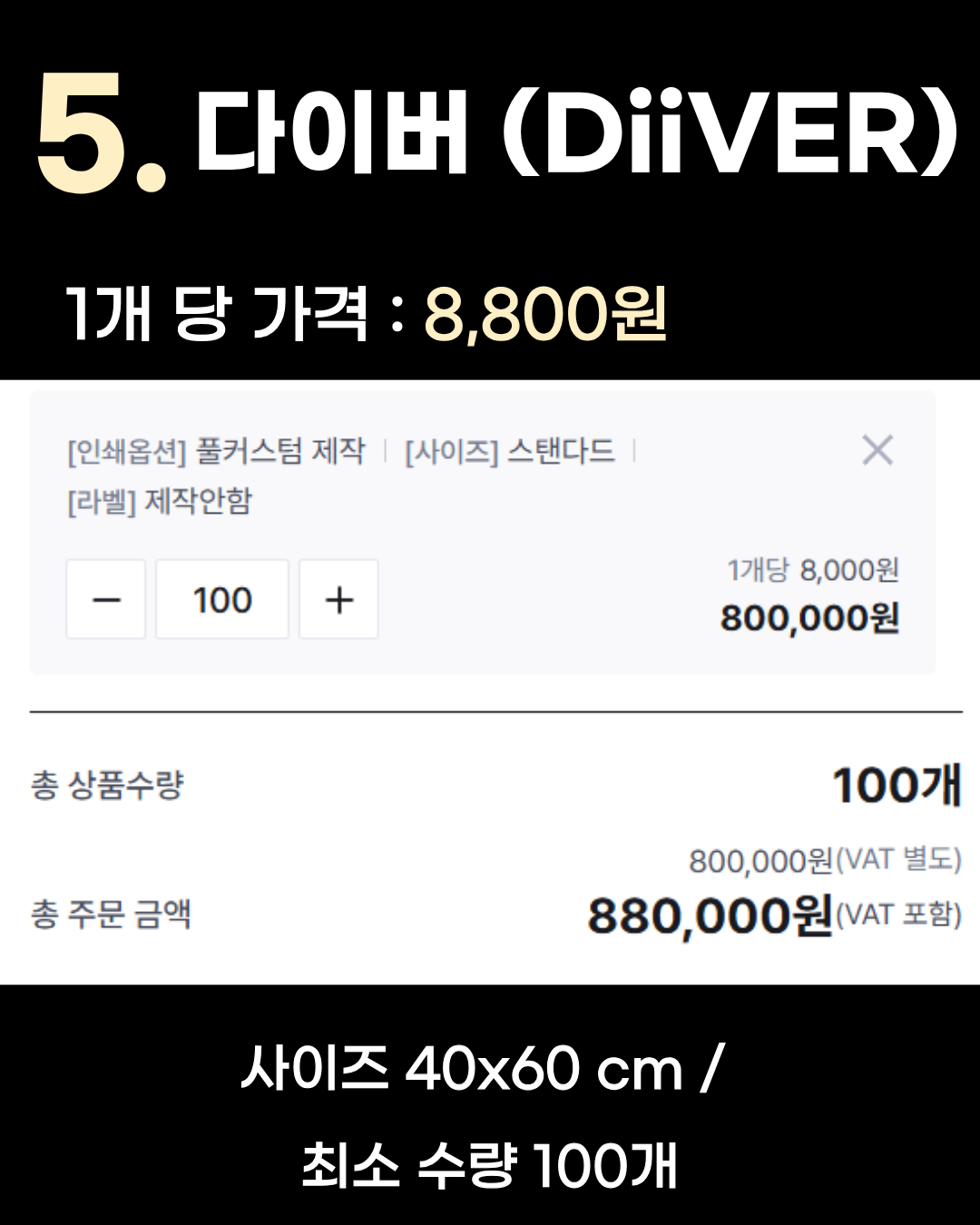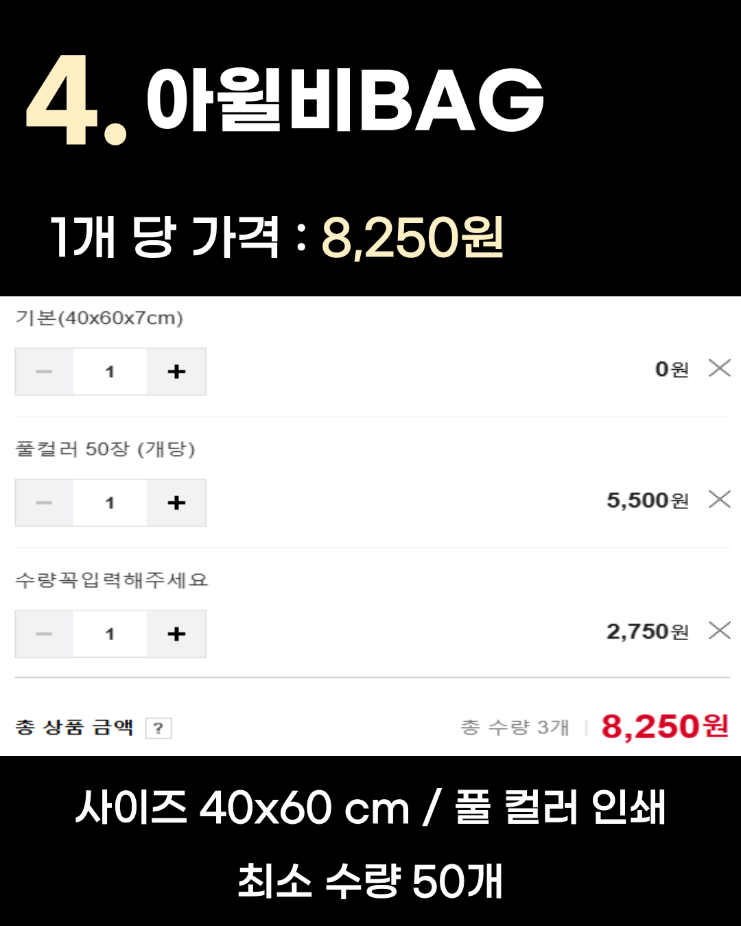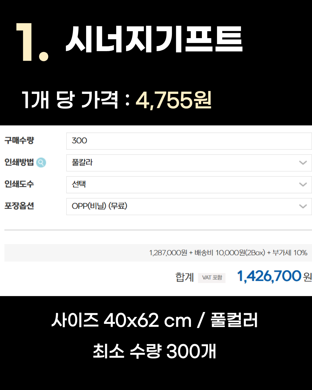 1개당 가격: 4,755원 (300개 주문 기준 합계 1,426,700원) 사이즈: 40x62 cm / 풀컬러 인쇄 최소 수량: 300개 특징: 대량 제작 시 압도적인 저렴함을 자랑합니다. 기업 판촉물이나 단체 굿즈로 추천해요.