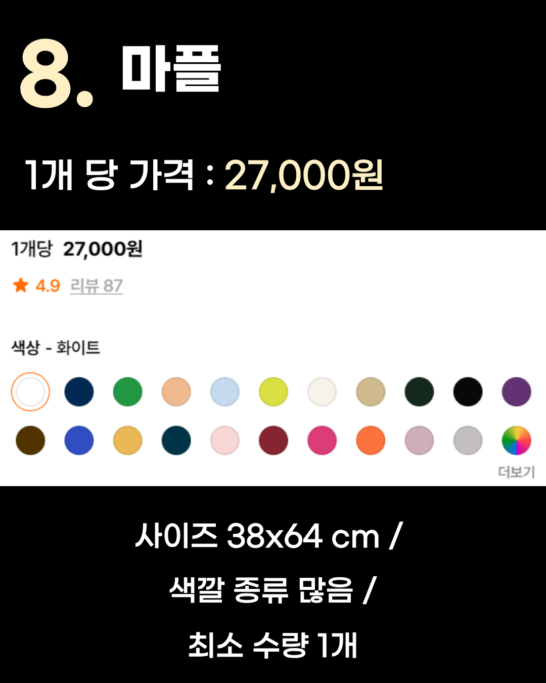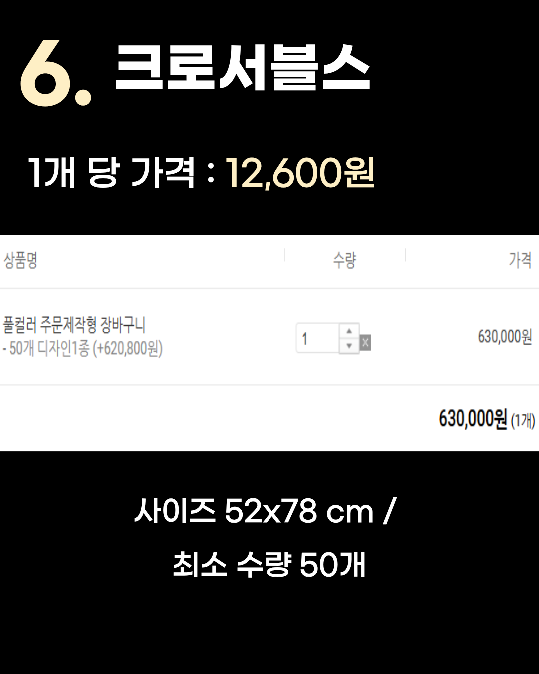 1개당 가격: 12,600원 사이즈: 52x78 cm 최소 수량: 50개 특징: 가격, 최소 수량이 적절합니다.