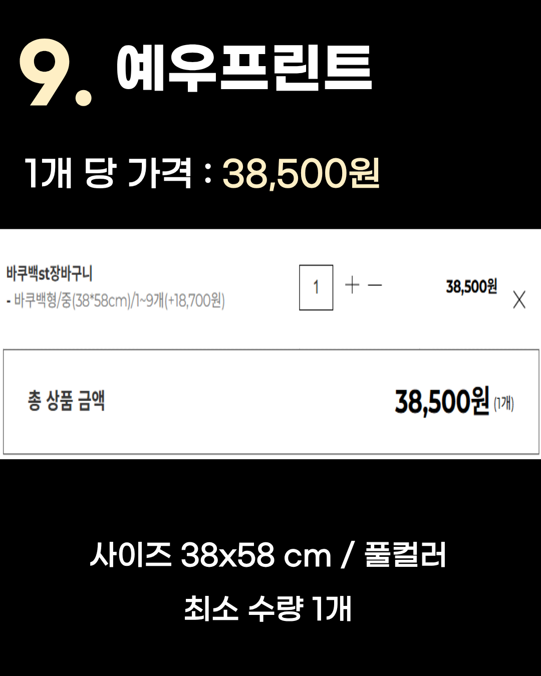 1개당 가격: 38,500원 사이즈: 38x58 cm / 풀컬러 최소 수량: 1개 특징: 역시 1개부터 제작 가능합니다.
