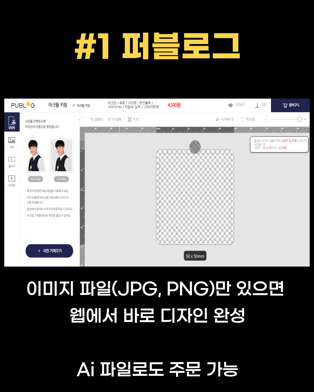 첫 번째로 소개할 곳은 다양한 사진 인화와 굿즈를 제공하는 퍼블로그입니다. 퍼블로그의 가장 큰 장점은 직관적인 웹 에디터입니다. 배경이 투명한 PNG 파일이나 일반 JPG 사진 파일을 에디터에 불러오기만 하면 끝! 아크릴 키링 등을 만들 때 가장 까다로운 '외곽선(칼선)'이 자동으로 생성되어 초보자도 아주 쉽게 제작할 수 있습니다. 지원 파일: 웹 디자인 (JPG, PNG) 추가 기능: Ai 파일로도 별도 주문 가능
