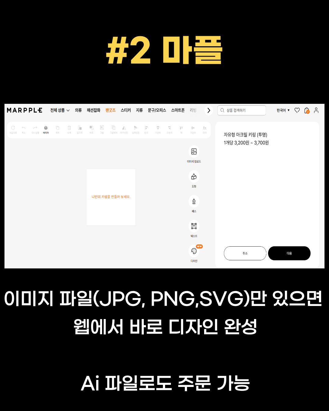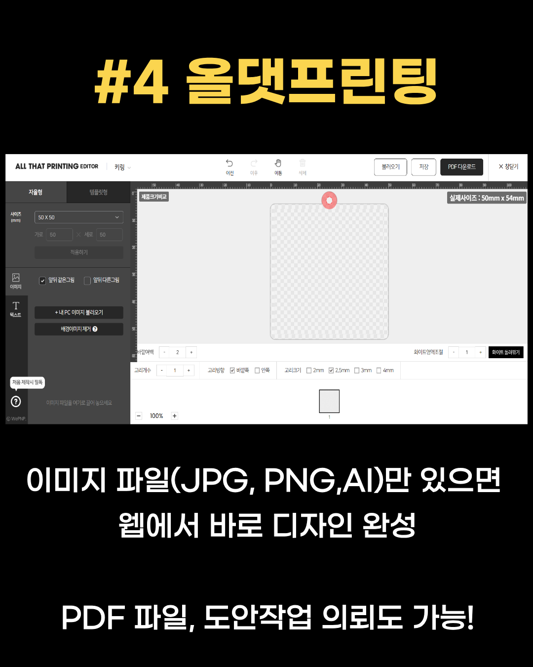 마지막으로 소개할 곳은 아크릴 굿즈 제작으로 유명한 올댓프린팅입니다. 이곳은 자유형/템플릿형 등 세밀한 웹 에디터 환경을 제공합니다. 특히 웹상에서 JPG, PNG 뿐만 아니라 AI 파일까지 바로 불러와 얹어볼 수 있다는 점이 매력적입니다. 지원 파일: 웹 디자인 (JPG, PNG, AI) 추가 기능: PDF 파일 주문 가능 꿀팁: 도안 작업이 정~말 어려운 분들을 위해 '도안 작업 의뢰' 서비스도 제공하고 있으니 막막할 때 이용해 보세요!