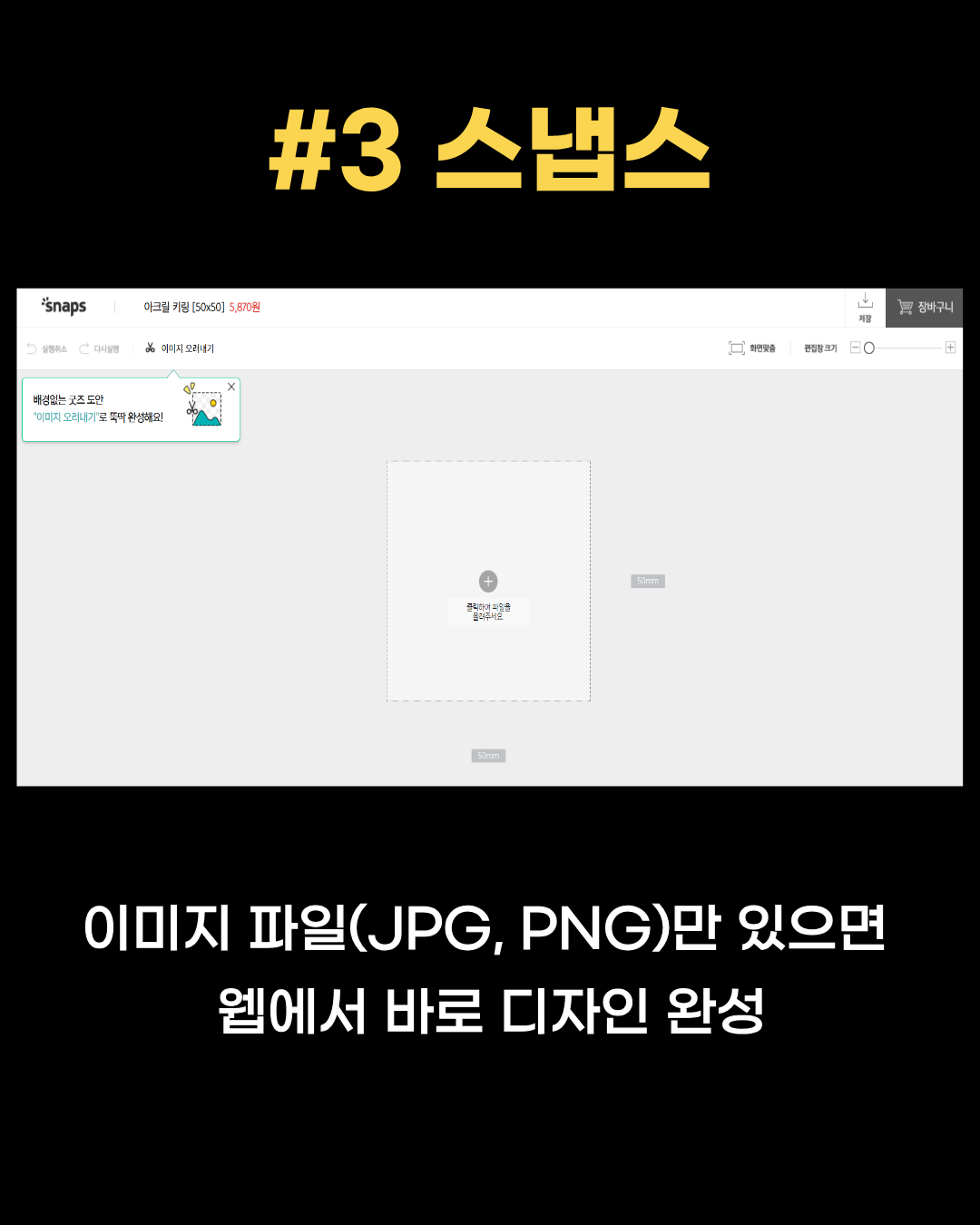 커스텀 굿즈의 대표주자, 마플입니다. 의류부터 폰케이스, 아크릴 키링까지 정말 다양한 상품군을 자랑하는데요. 마플 역시 별도의 프로그램 설치 없이 웹사이트 내에서 바로 나만의 디자인을 입혀보고 결과를 미리 확인할 수 있습니다. #3. 스냅스 (Snaps)