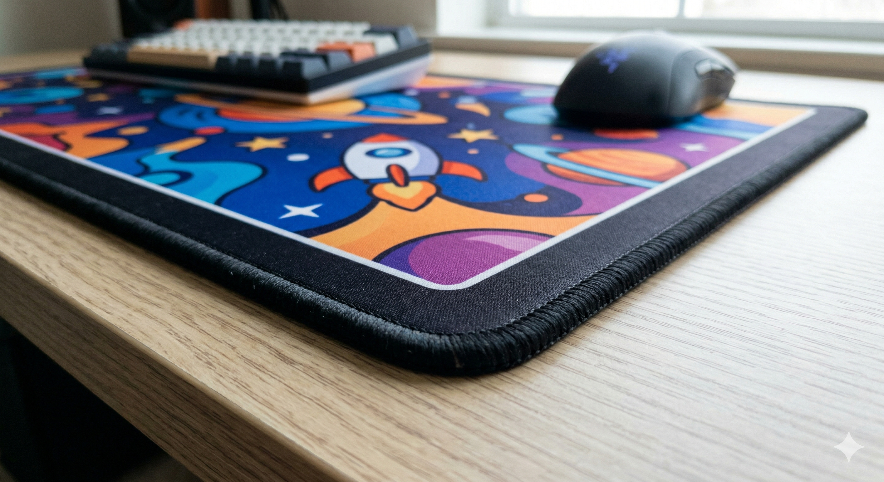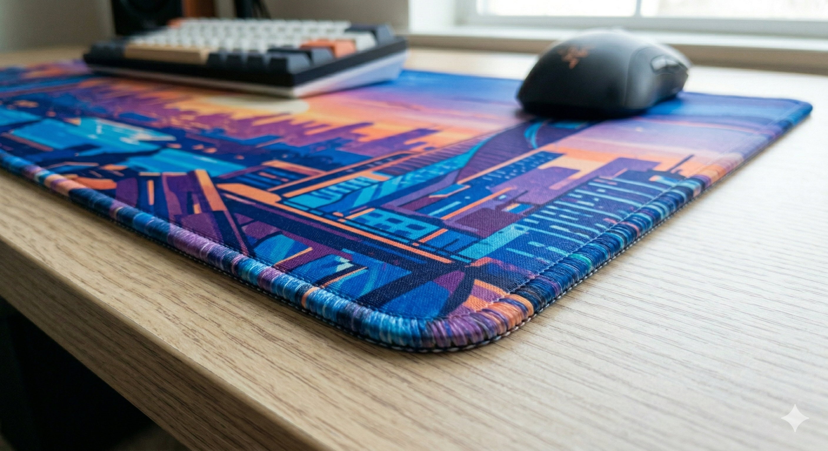장점: 그림이 패드 끝단까지 시원하게 이어지기 때문에 몰입감과 일체감이 매우 뛰어납니다. 고급형 굿즈나 게이밍 장패드에서 주로 선호하는 방식입니다.